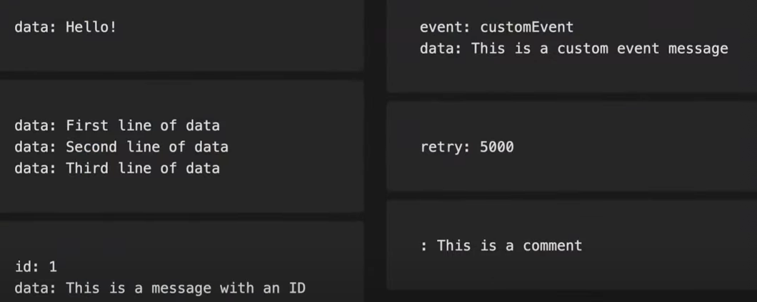- 클라이언트가 보내는 요청에는 SSE통신을 통해 이벤트 스트림이라는 형식의 메시지를 수신하겠다는 의미의 헤더가 실리고, 서버는 해당 형식(이벤트 스트림)으로 작성된 메시지임을 명시하는 헤더가 포함된 응답을 보냄