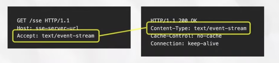 - 클라이언트가 보내는 요청에는 SSE통신을 통해 이벤트 스트림이라는 형식의 메시지를 수신하겠다는 의미의 헤더가 실리고, 서버는 해당 형식(이벤트 스트림)으로 작성된 메시지임을 명시하는 헤더가 포함된 응답을 보냄